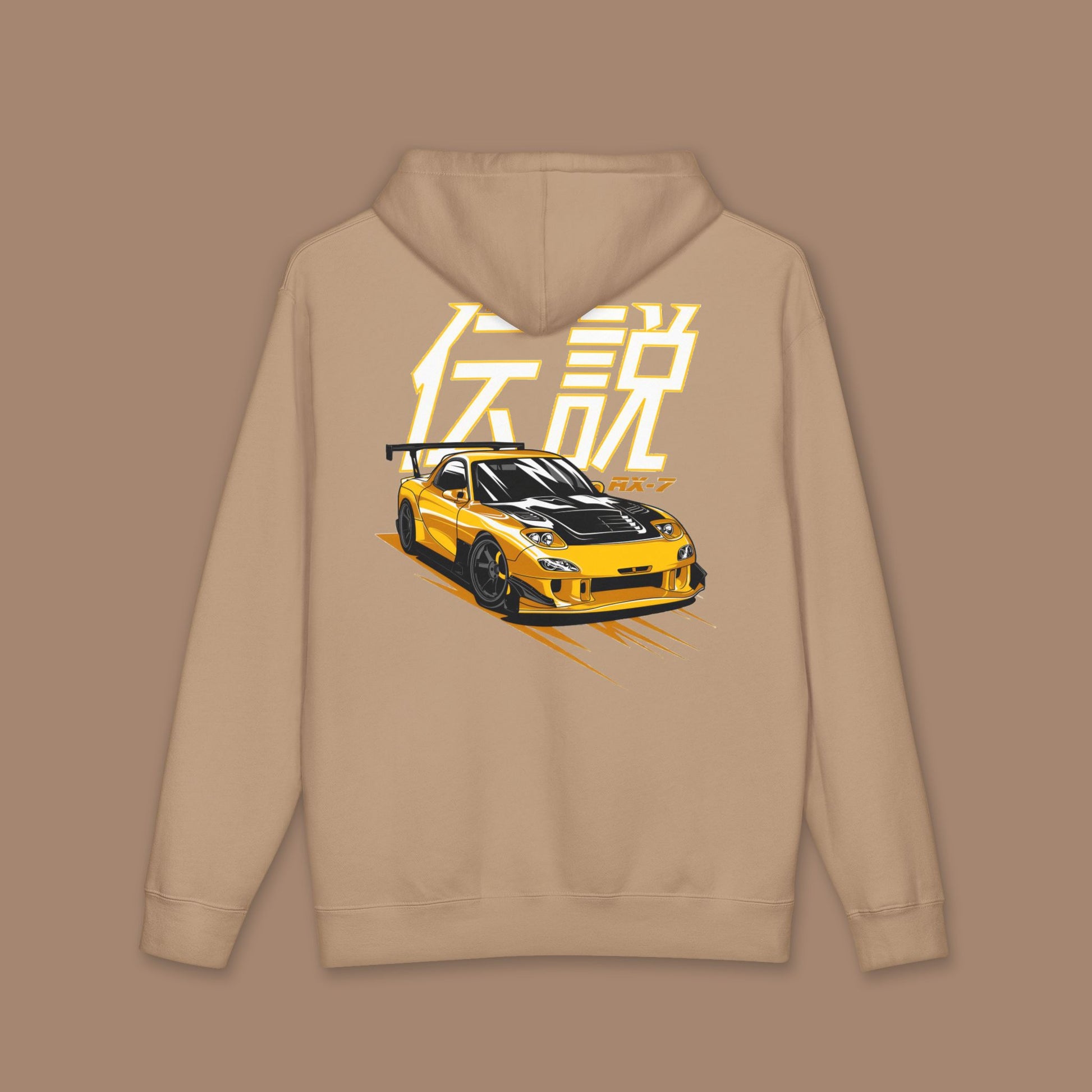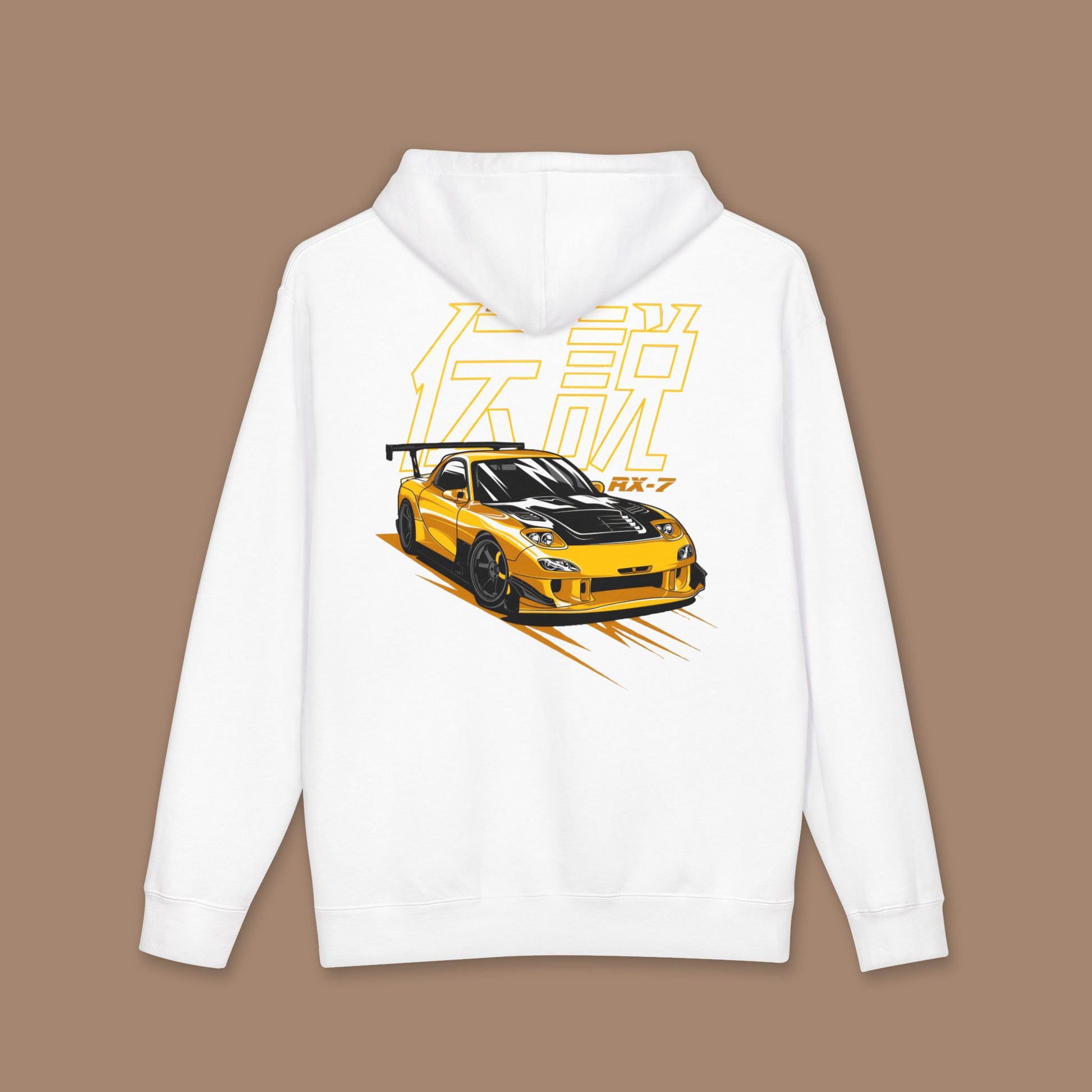 RX-7 inspired hoodie with fleece lining for added warmth. Perfect for a casual and cozy vibe, great for lounging or running errands. Ideal for fans of RX- and those looking for a comfortable statement piece. Relevant for casual wear, lounging at home, or attending casual gatherings.